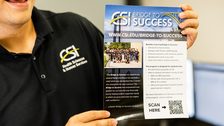 We want you to feel confident and ready as you start your journey at CSI. Through the Bridge to Success Program, students get extra support to make the most of everything CSI has to offer. From signing up for classes to finding financial aid, we’re here for you every step of the way.